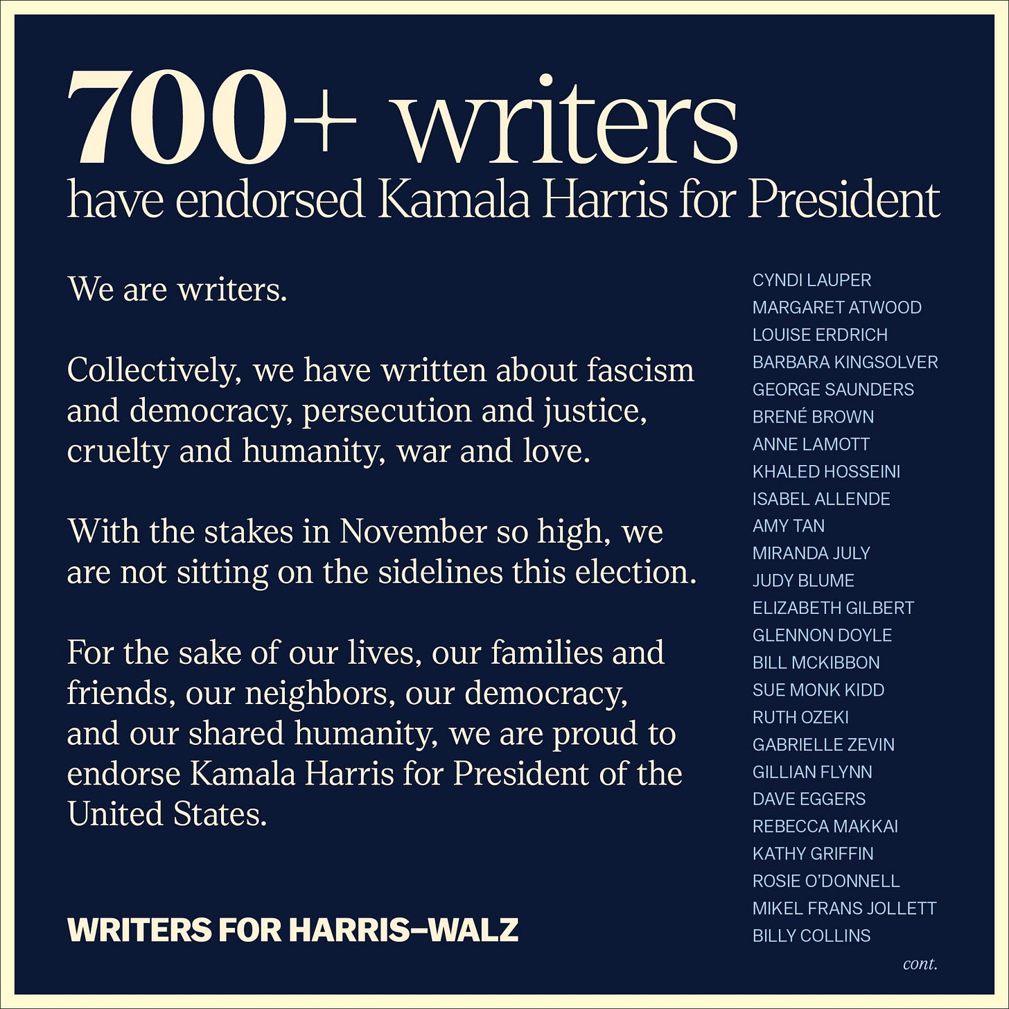 We at Authors4Harris are proud to number among the more than 700 internationally recognized authors, essayists, lyricists, screenwriters, playwrights, poets, and journalists who have endorsed Kamala Harris for President of the United States. [Showing more integrity and courage than the owners of the Washington Post and Los Angeles Times.]